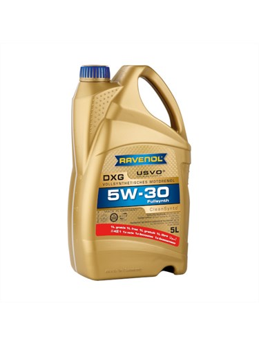 RAVENOL DXG SAE5W-30 – полностью синтетическое моторное масло на основе полиальфаолефинов (ПАО), изготовленное с применением технологий USVO® и CleanSynto® для легковых бензиновых моторов с и без турбонаддува и прямым впрыском топлива.